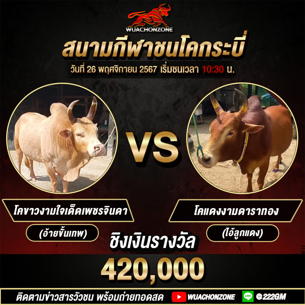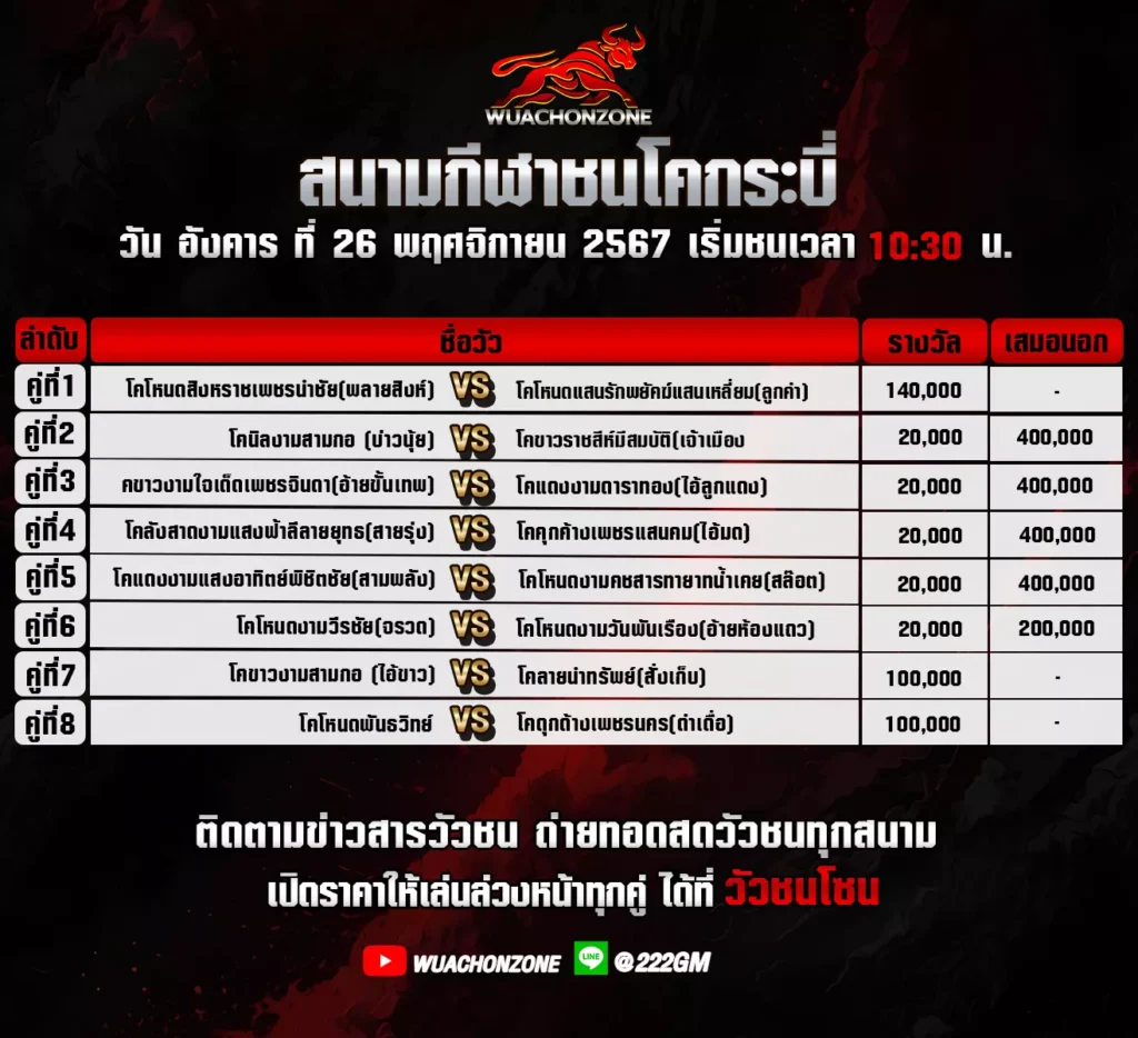 โปรแกรมวัวชน สนามชนโคกระบี่ วันที่ 26 พฤศจิกายน 2567