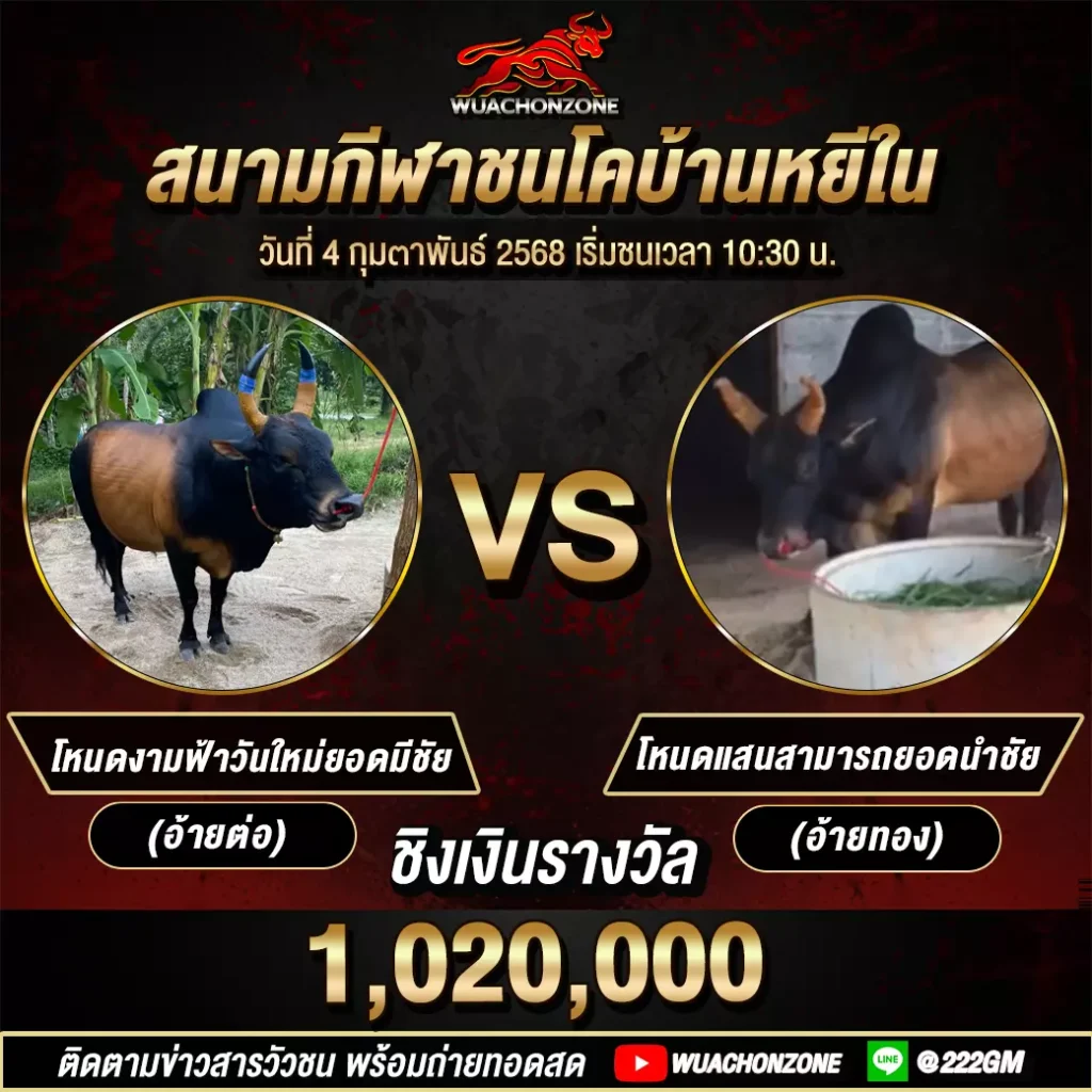 เตรียมพบกับการแข่งขันกีฬาวัวชนสุดยิ่งใหญ่แห่งปีกับ โปรแกรมวัวชน วันที่ 4 กุมภาพันธ์ 2568 ที่จะจัดขึ้นในสองสนามยอดนิยมของวงการ ได้แก่ สนามกีฬาชนโคบ้านหยีใน คอมเพล็กซ์ งานนี้มีวัวชนชื่อดังจากทั่วประเทศเข้าร่วมประชันความแข็งแกร่ง โดยแต่ละคู่ต่างเต็มไปด้วยนักสู้สายพันธุ์ดี ที่พร้อมสร้างตำนานหน้าใหม่ให้กับวงการวัวชนไทย ! อย่าพลาดโอกาสในการชมการแข่งขันสดสุดมันส์ พร้อมส่งกำลังใจให้วัวชนคู่โปรดได้ในสนามหรือผ่านการ ถ่ายทอดสดวัวชน ในเว็บไซต์ของเรา