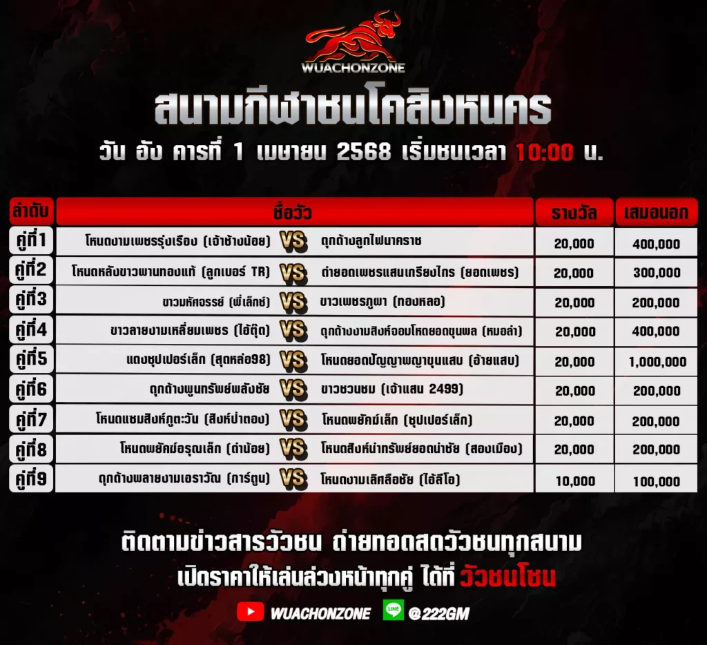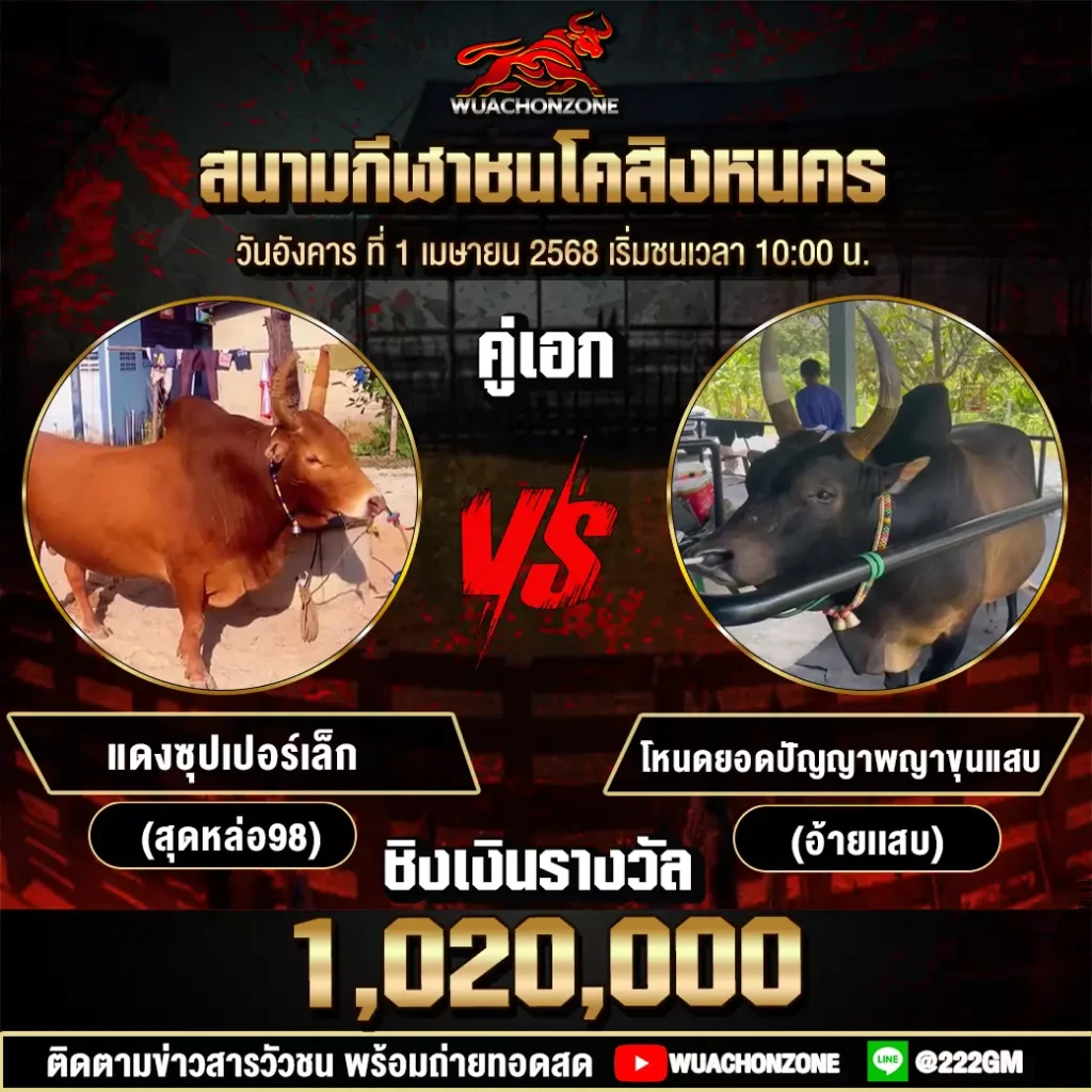 โปรแกรมวัวชน สนามชนโคสิงหนคร วันที่ 1 เมษายน 2568