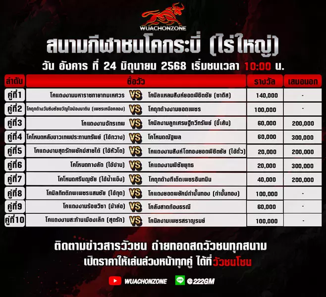 โปรแกรมวัวชน วันที่ 24 มิถุนายน 2568