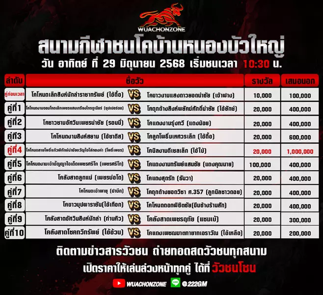 โปรแกรมวัวชน สนามชนโคบ้านหนองบัวใหญ่ วันที่ 29 มิถุนายน 2568